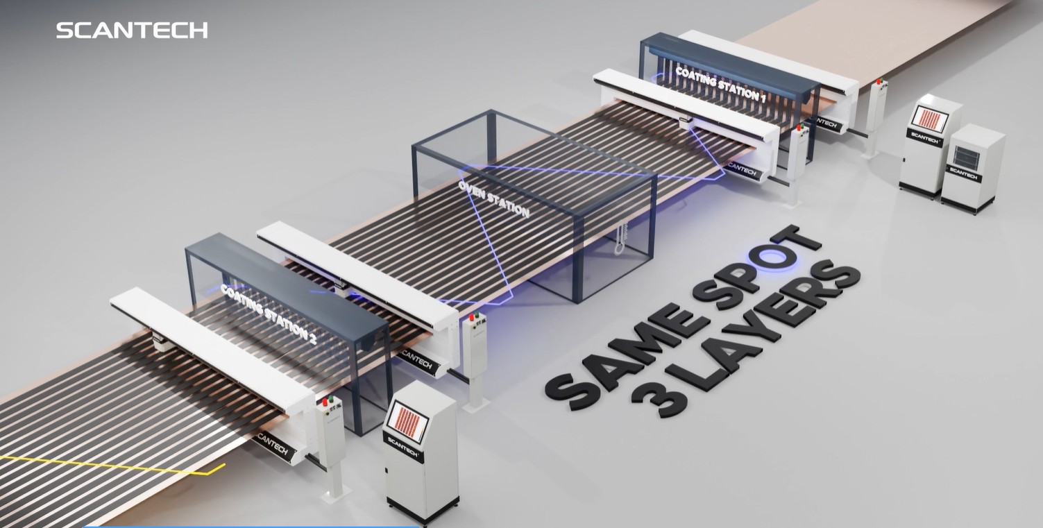 A coating line with substrate & coating measurement scanners. Closed-loop control can be applied to automatically adjust for optimal thickness, weight, and density without operator intervention. Courtesy: Scantech